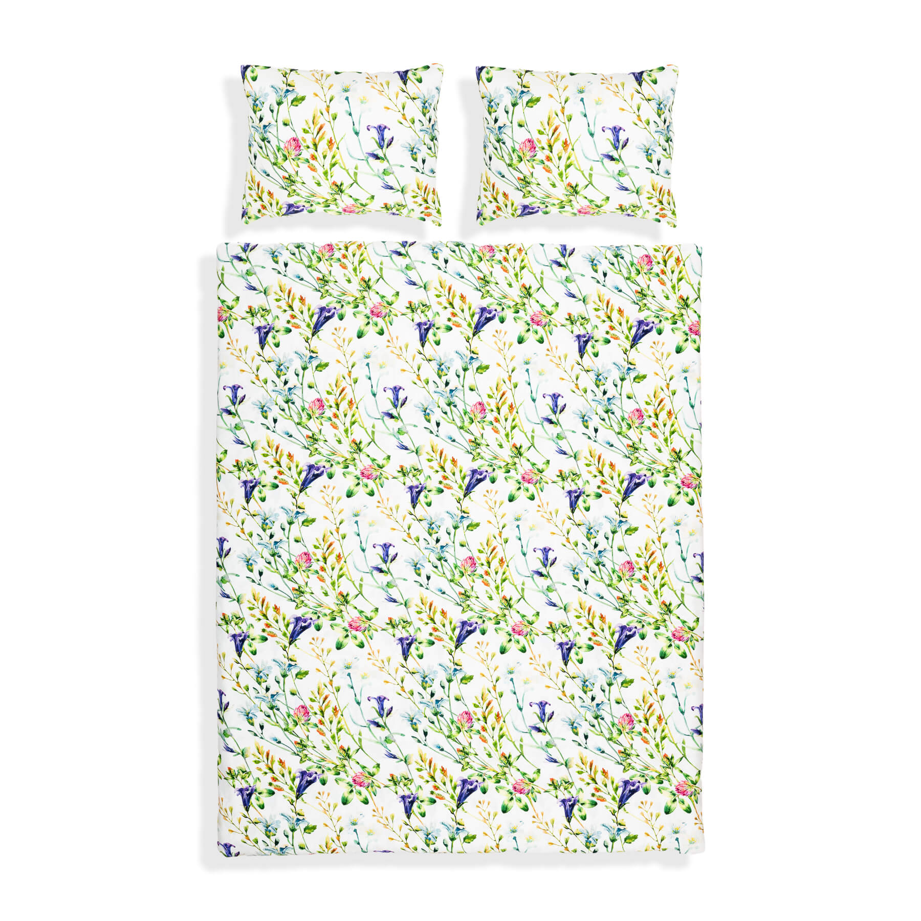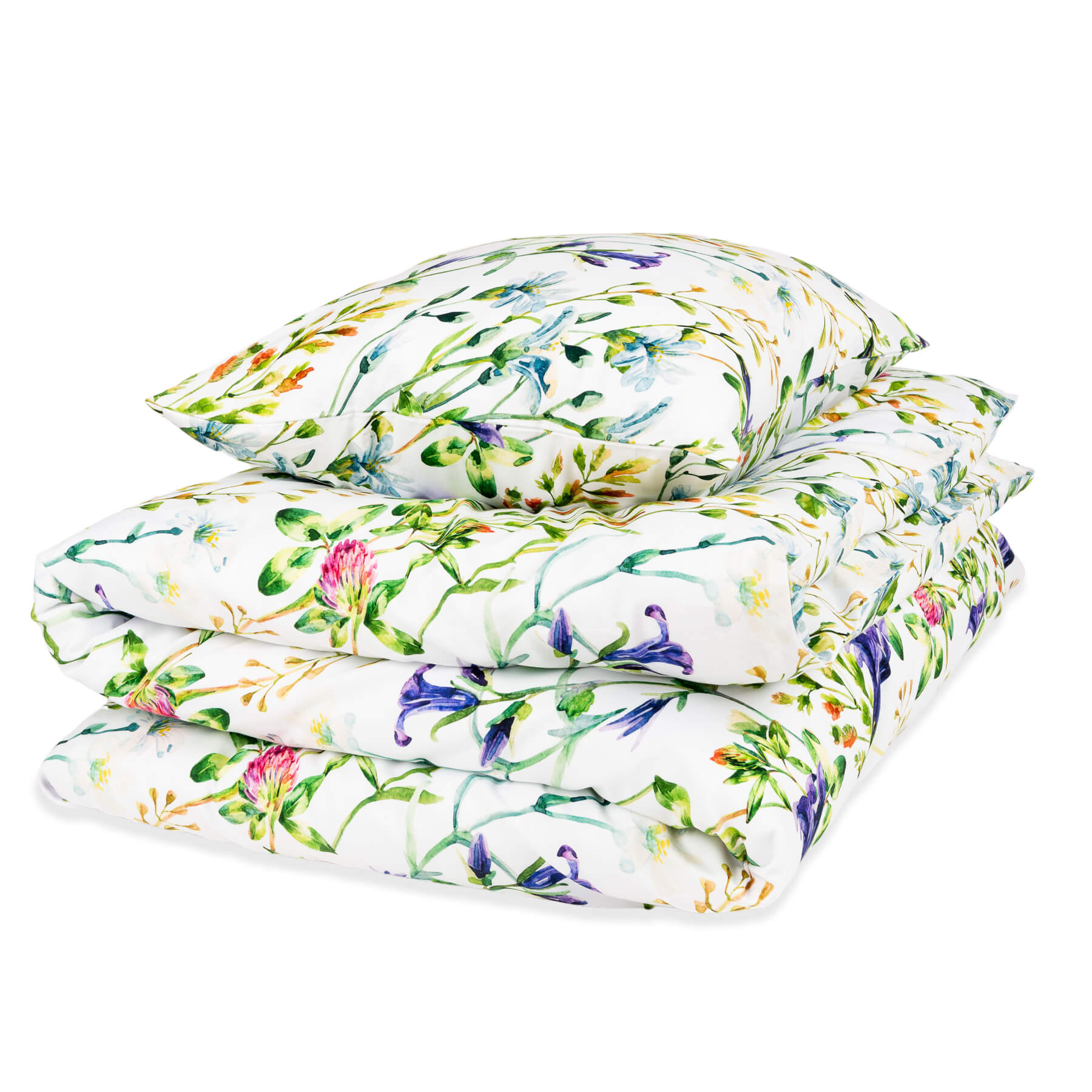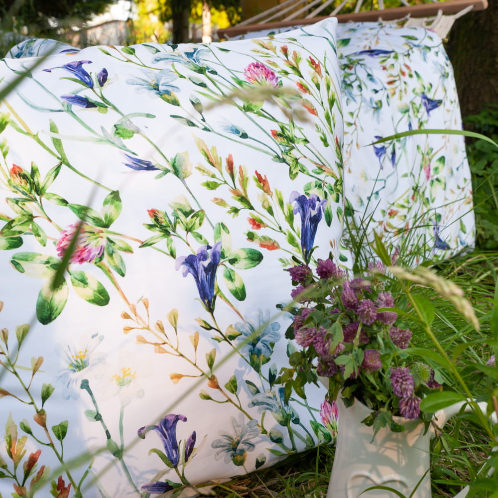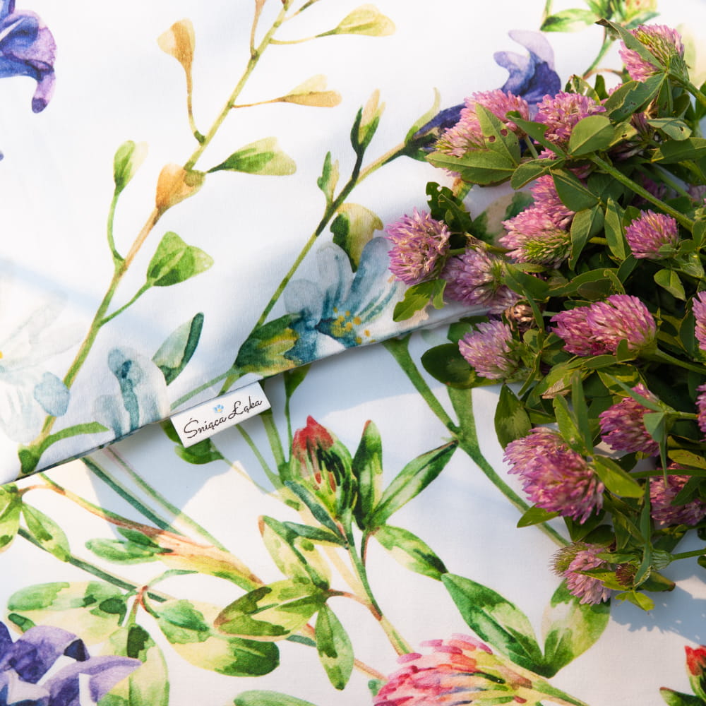 Wzór "KONICZYNA" to piękna, artystyczna grafika akwarelowa, której motywem przewodnim są kwiaty koniczyny i dzwonków, nadające pościeli sielski charakter.