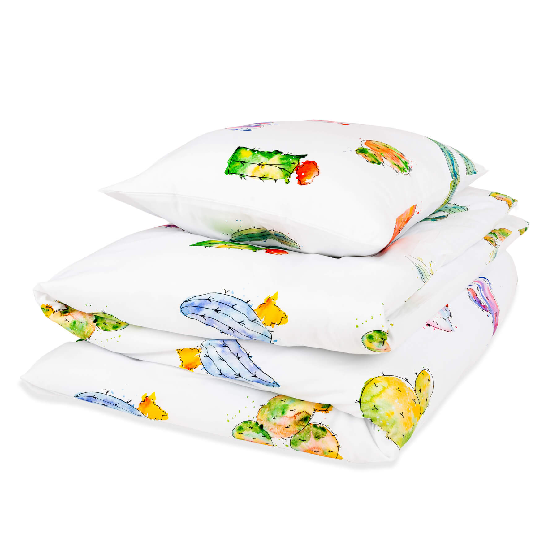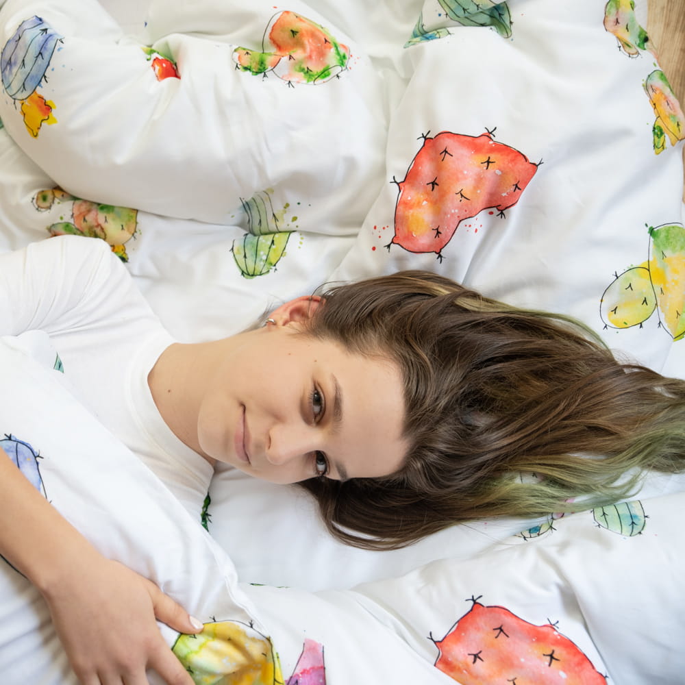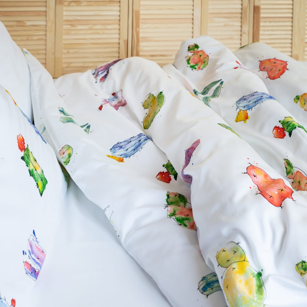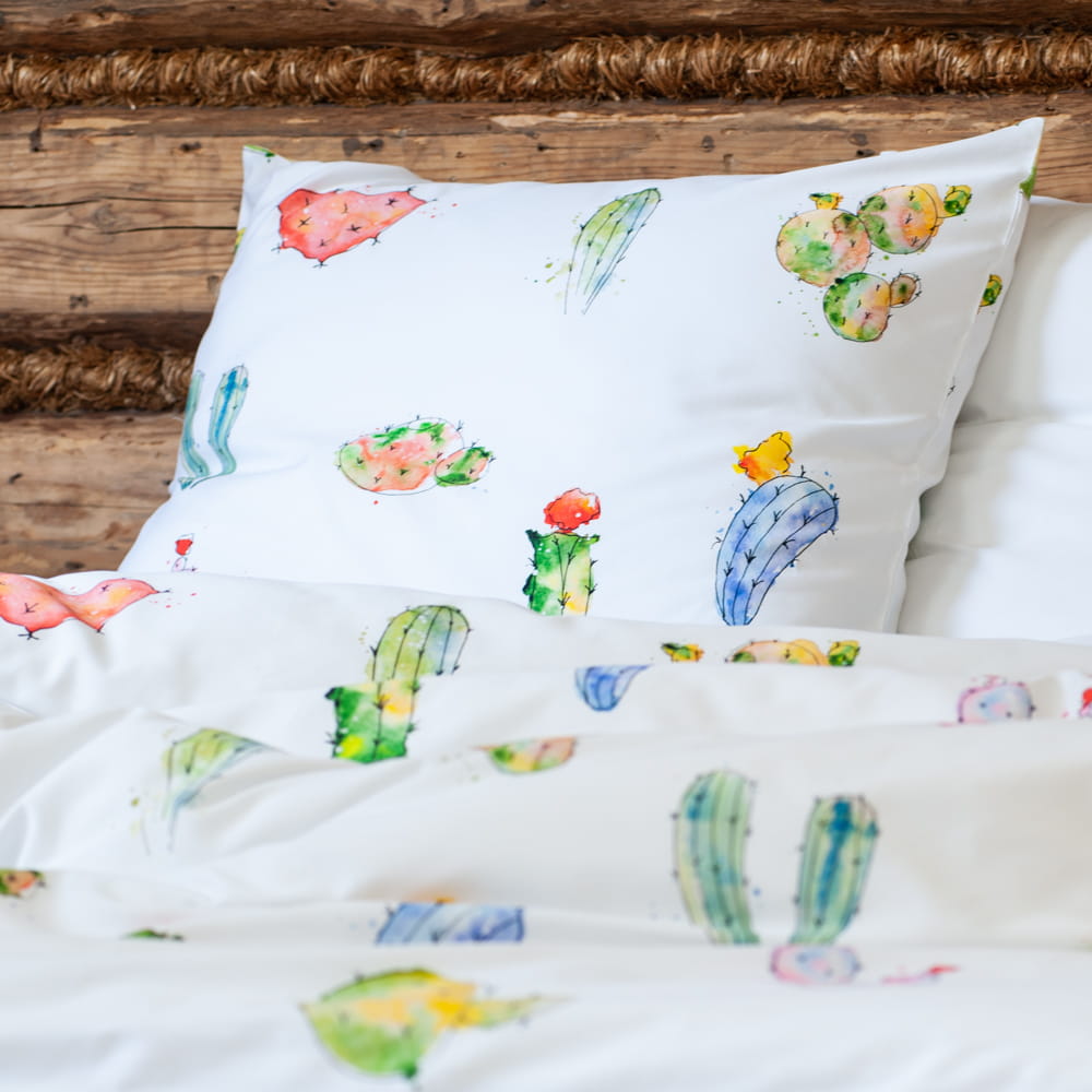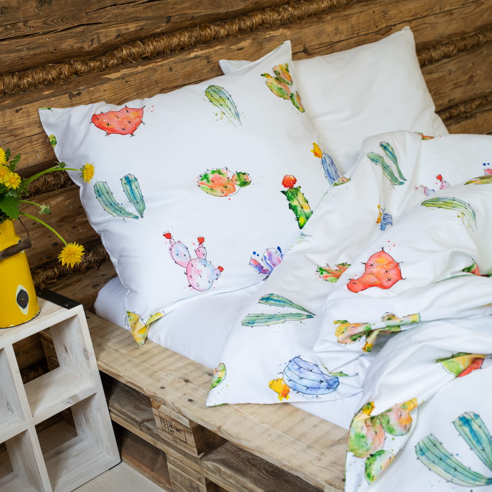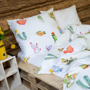 Proponujemy Państwu pościel wykonaną z wysokiej jakości bawełny, o miękkim i przyjemnym dla skóry splocie satynowym. Wzór „KAKTUSY” to piękna, artystyczna grafika akwarelowa, z zabawnymi i kolorowymi motywami kaktusów rozmieszczonych na białym tle.