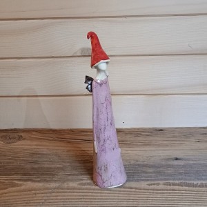 Ręcznie wykonana figurka anioła w czapce skrzata w lawendowej szacie. Skrzydełka z metalicznym efektem.