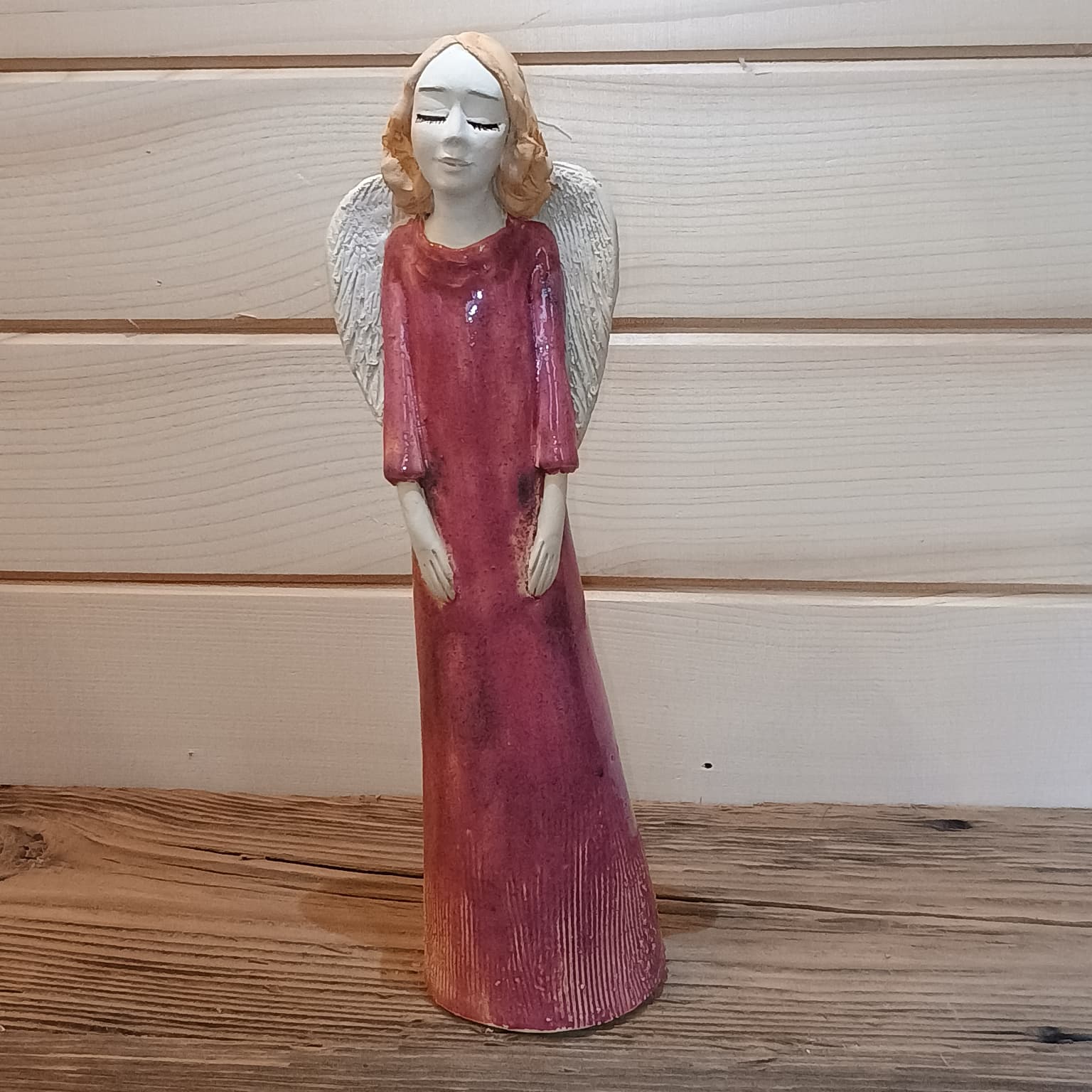 Ręcznie wykonana, ceramiczna figurka stojącego anioła.