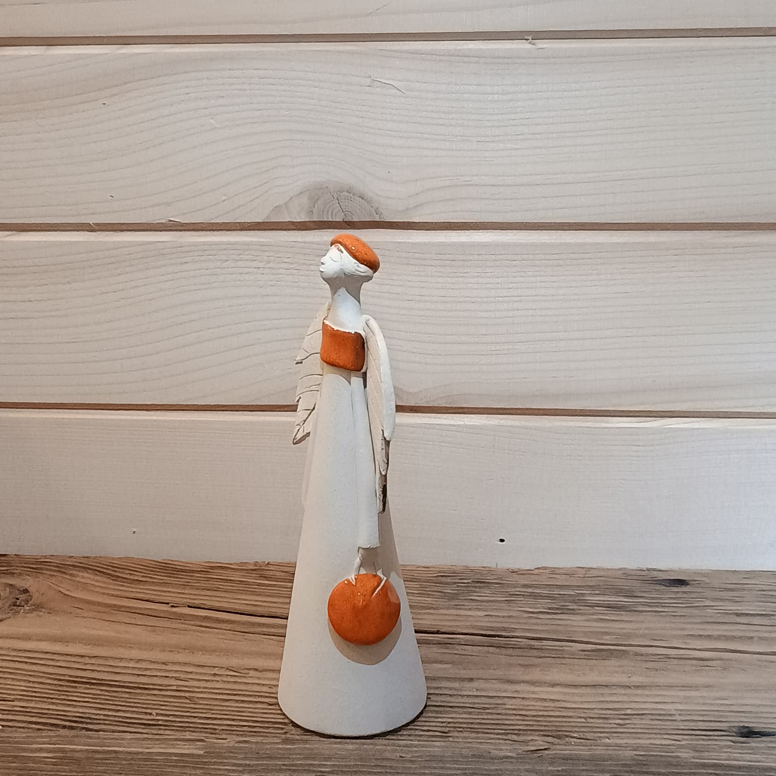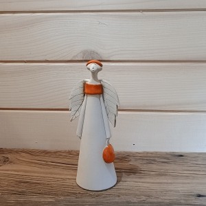 Anioł ceramiczny z pomarańczową torebką