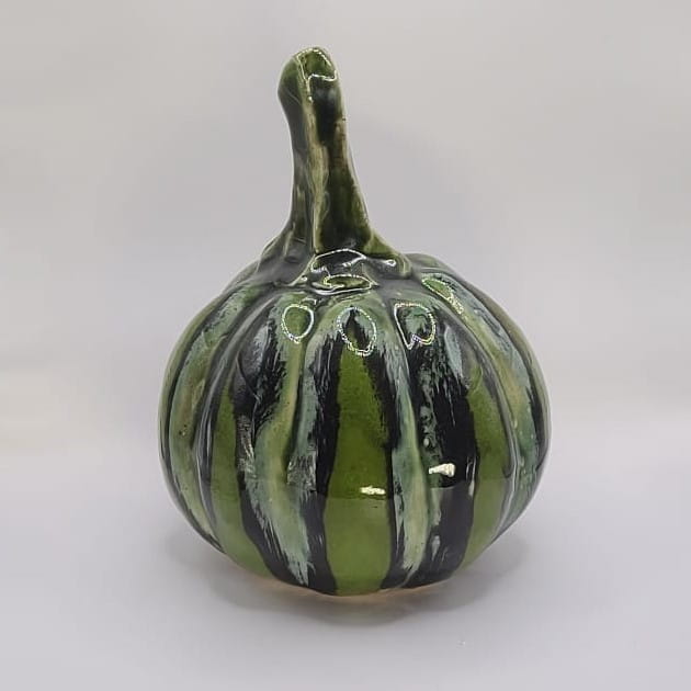 Ręcznie wykonana ceramiczna dynia. Piękne przebarwienia różnych odcieni zielonego szkliwa.