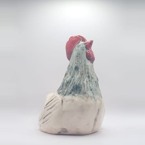 Ręcznie wykonana figurka siedzącej kurki, z czerwonym grzebieniem i dziobem. Tułów poszkliwiony w kolorze kremowym i szarym.