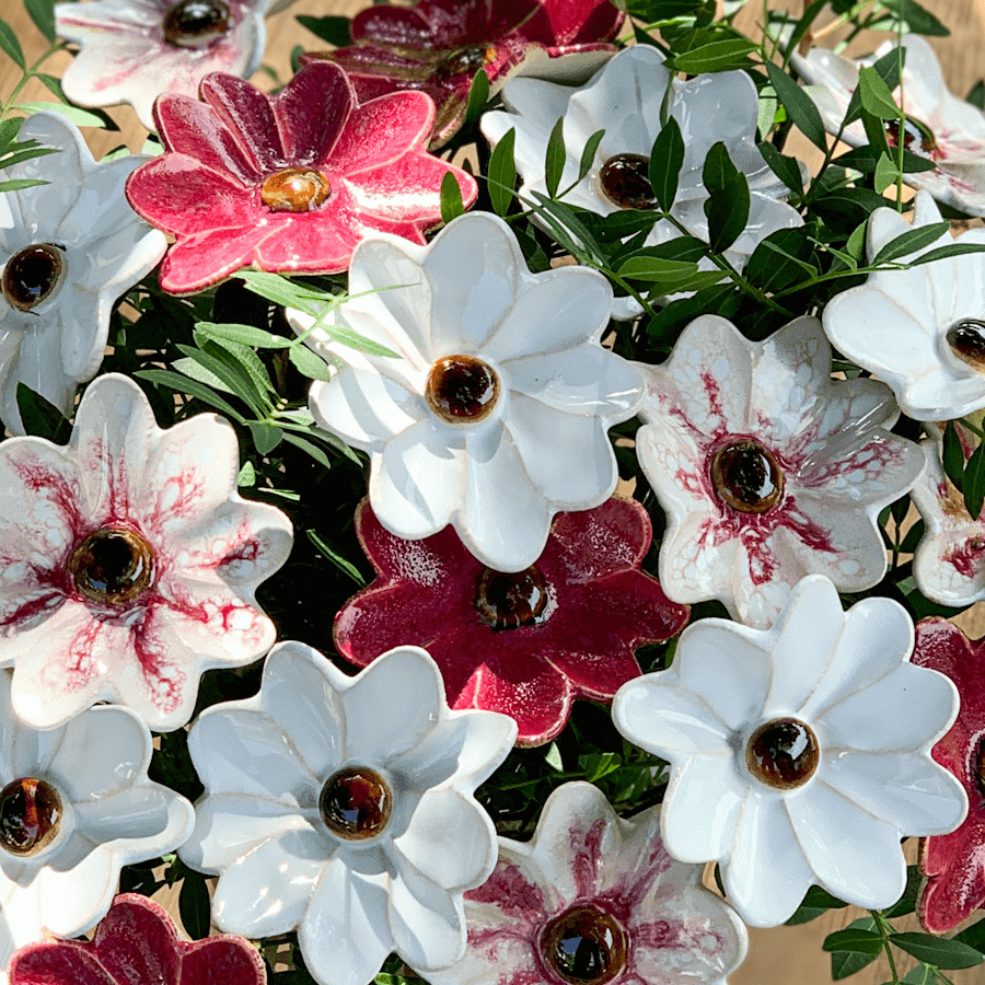 Ceramiczne, ręcznie wykonane kwiaty w bardzo dużej gamie kolorystycznej. Płatki kwiatów uformowane bardzo realistycznie, pofałfdowane, przepięknie poszkliwione w intensywnych kolorach, błyszczące..