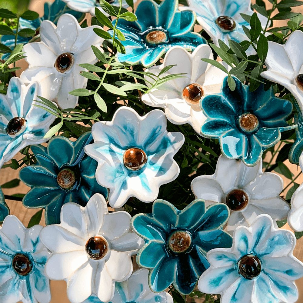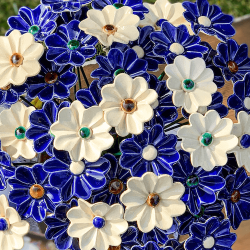 Ceramiczne, ręcznie wykonane kwiaty w bardzo dużej gamie kolorystycznej. Płatki kwiatów uformowane bardzo realistycznie, pofałfdowane, przepięknie poszkliwione w intensywnych kolorach, błyszczące..