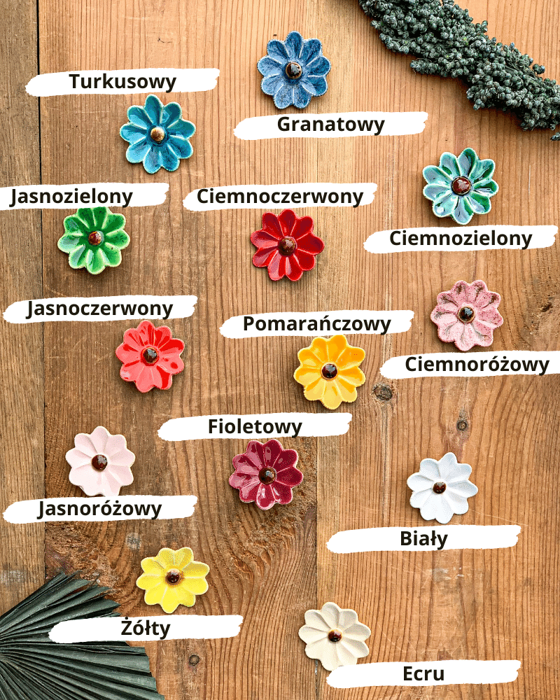 Drobne kwiaty uroczych, ceramicznych margaretek w 12 wersjach kolorystycznych.