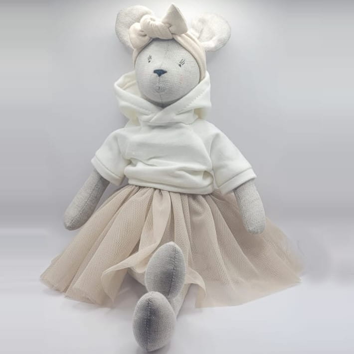 Urocza laleczka wykonana ręcznie z niezwykłą starannością i z użyciem wysokiej jakości tkaniny lnianej. Elementami stroju są tiulowa spódniczka, elastyczna opaska wiązana na głowie i precyzyjnie wykonana, bawełniana bluza z kapturem lub bez (szczegóły widoczne na zdjęciu). Wszystkie ubranka są zdejmowalne. Laleczka mierzy około 40 cm wysokości. Pakowana w eleganckie, karbowane pudełko papierowe z okienkiem. Idealnie nadaje się na prezent.